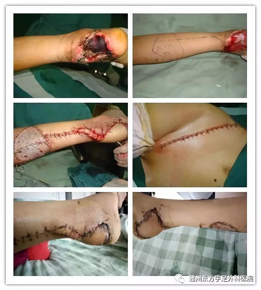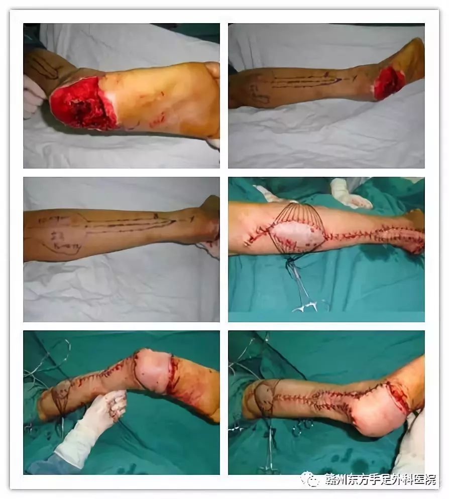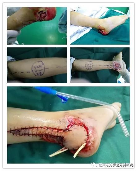 手术方案:腓动脉穿支+腓肠神经皮瓣+取皮植皮修复术