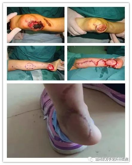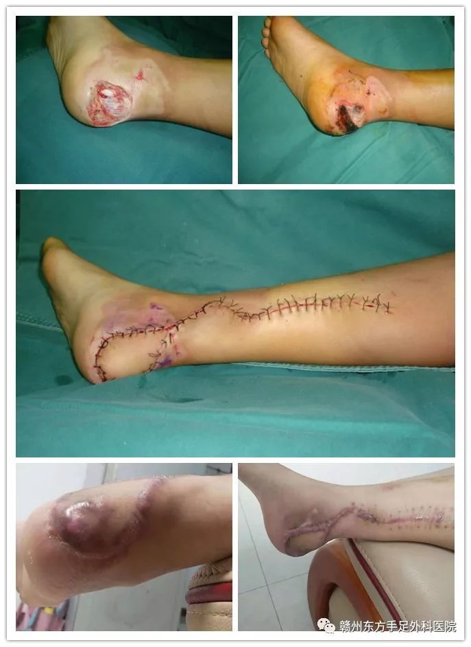 患儿女、7岁、摩托车链条绞伤右足跟部、外踝复合组织缺损